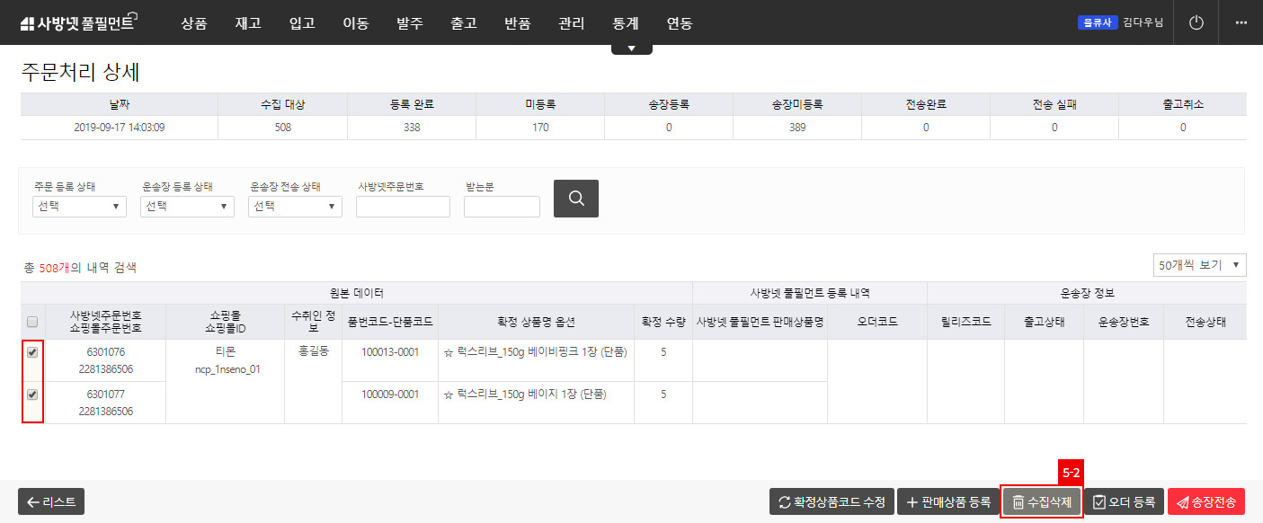 4) 주문처리 상세페이지에서 “수집삭제” 버튼으로 수집을 삭제합니다.