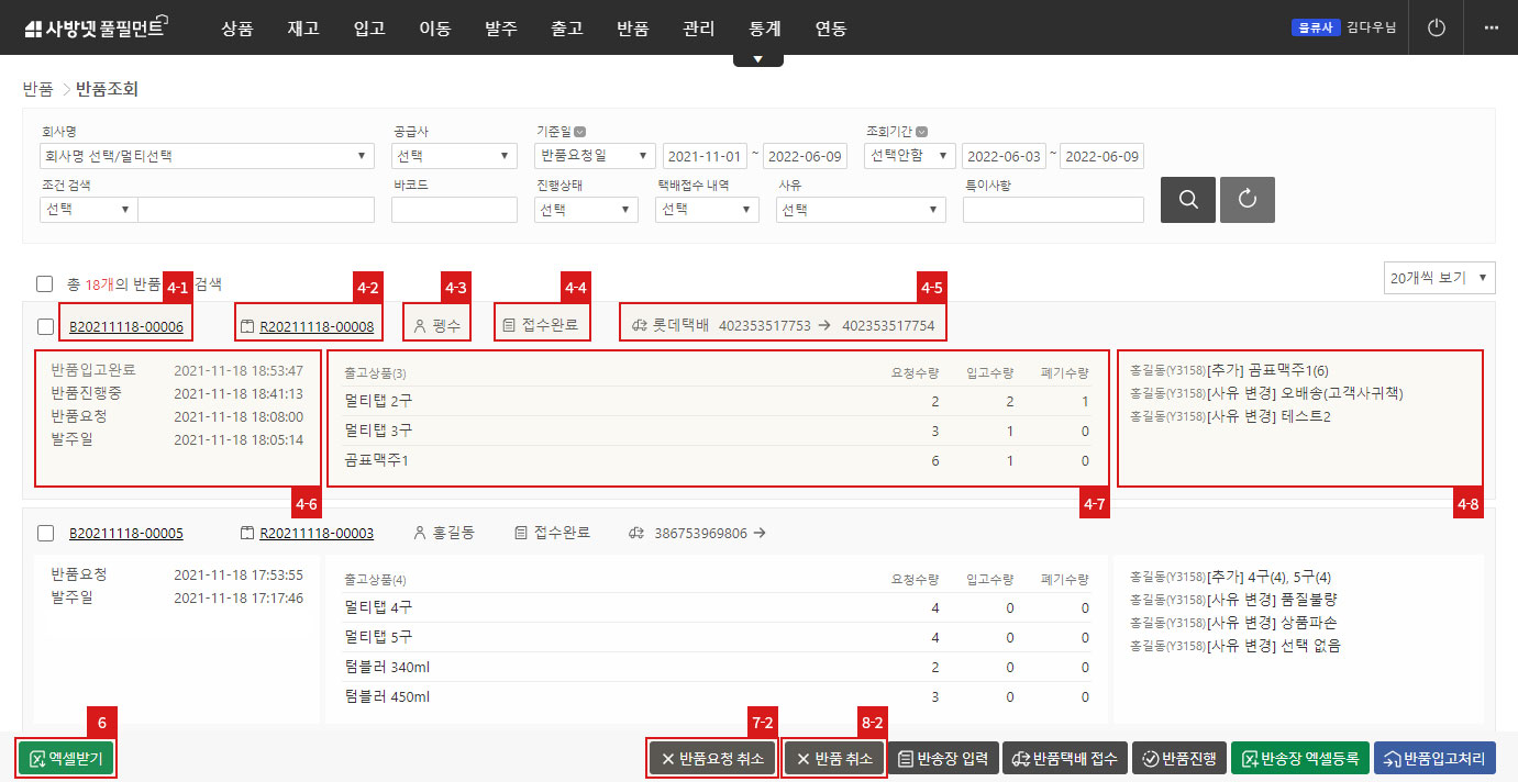 반품진행중, 반품취소, 반품입고완료는 물류사가 진행합니다.