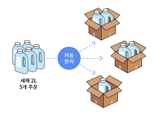 설정을 2리터 세제 2개로 설정해두면 2리터 2개 2박스 + 2리터 1개 1박스로 주문을 분리합니다.