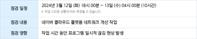 2024년 3월 12일(화) ~ 13(수)에 네이버 클라우드 플랫폼 네트워크 개선 작업이 진행됩니다.